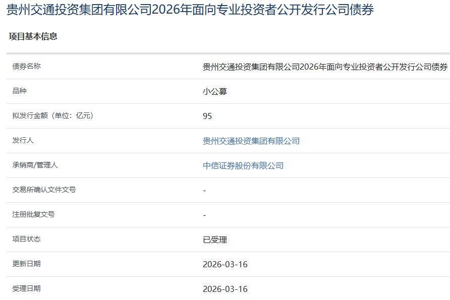 【大河财立方消息】3月17日消息,贵州交通投资集团有限公司2026年面向专业投资者公开发行公司债券项目获上交所受理。本期债券拟发行金额95亿元,承销商/管理人为中信证券。